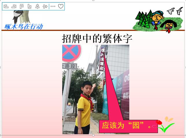 六年级开展“啄木鸟——寻找错别字”行动,对校园和社区不规范的错别字和繁体字进行调查。