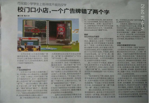 通过这次活动,同学们收获很多。 “我发现在我们身边,在生活中有许多繁体字,错别字,不规范字,这些字的出现,有的是商家为了宣传需要,有些是实实在在的错误!如果一直这样,是会影响我们学生学习中华民族博大精深的语言文字!”605班的邵祎洋同学说道。